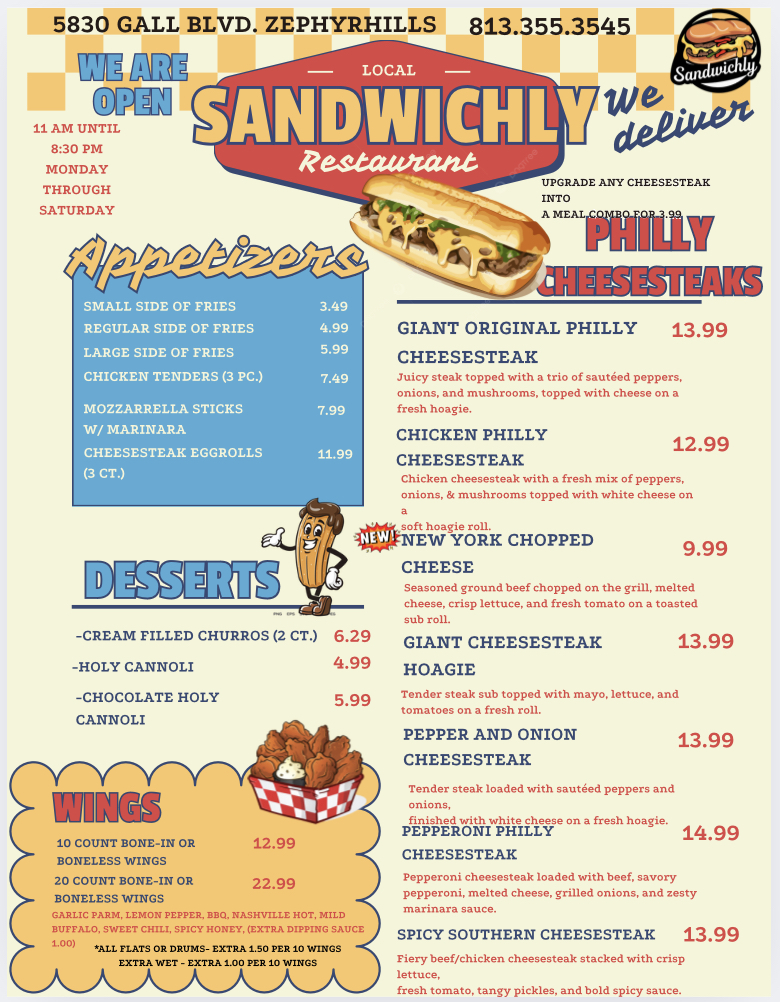 If you’re browsing through the Sandwichly Menu, you’ll quickly notice it’s the kind of place where comfort food feels a little extra comforting. Tucked away at 5830 Gall Blvd in Zephyrhills, this spot has a way of drawing you in with its mix of familiar favorites and playful twists. As you read through the offerings, you’ll find sandwiches stacked with fresh ingredients, sides that feel like they came straight from someone’s home kitchen, and flavors that balance indulgence with a touch of everyday simplicity.